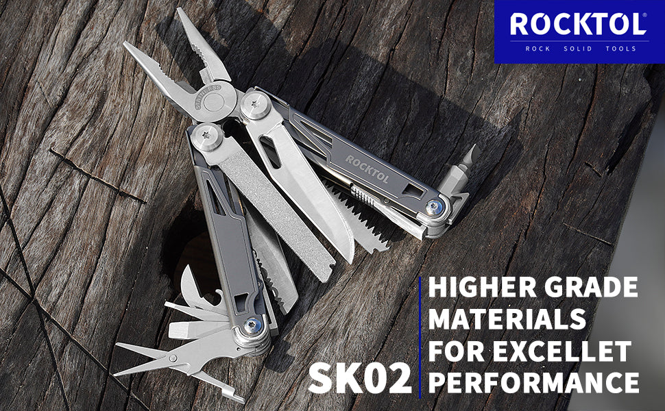 Introducing Rocktol high-quality 19-in-1 multitool, featuring a Titanium-plated handle and an ultra-sharp 7Cr17 stainless steel knife with a hardness up to HRC 58. It's perfect for tough jobs and outdoor adventures. Each tool is equipped with a safety locking mechanism for added security, and the durable stainless steel construction ensures that it's built to last. Plus, the compact and lightweight design, along with a sturdy nylon sheath, makes it easy to carry with you wherever you go. Don't settle for anything less than reliable - choose this top-notch multitool for your everyday tasks or for your next outdoor adventure!